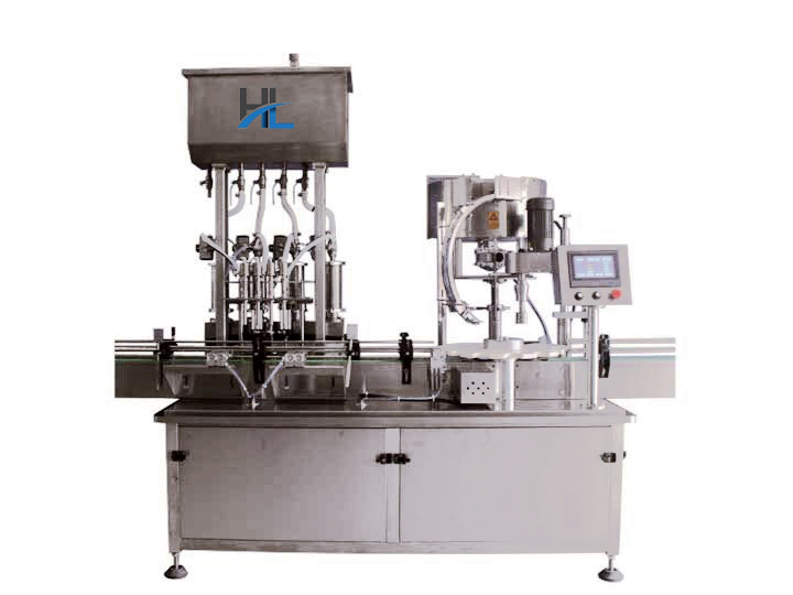 该机灌装部分采用伺服电机驱动、容积式计量充填原理,实现了灌装剂量的高精度。旋盖部分由供盖系统、刮盖、压盖、夹紧、输瓶和旋盖等完成自动旋盖。整机具有运行稳定可靠、生产效率高、适应性强的特点。